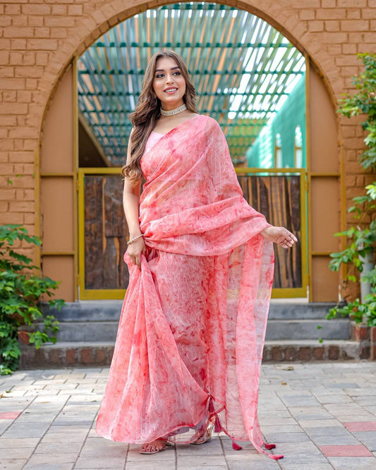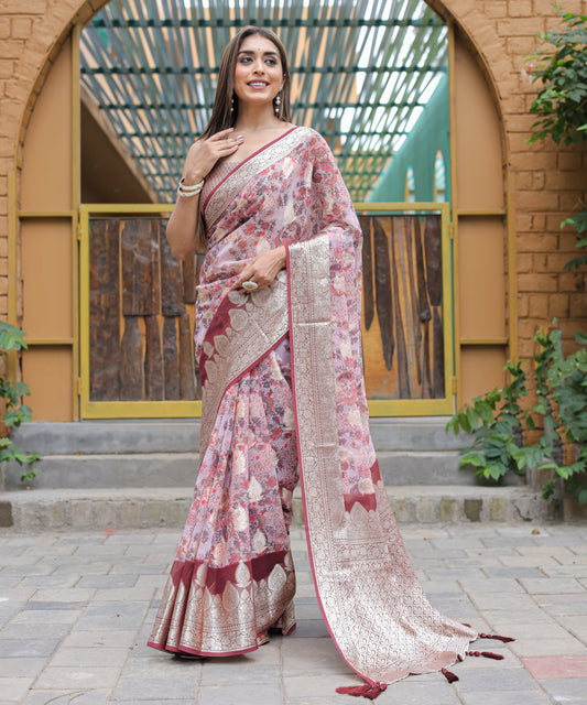 Pure Georgette Salmon-Pink saree in Digital-Print with Maroon Heavy Zari Border and Tassels paired with Blouse