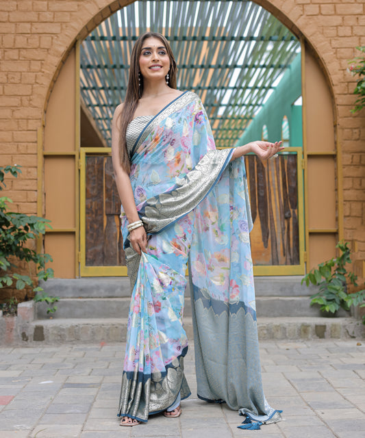 Pure Georgette Powder-Blue saree in Digital-Print with Dark-Blue Heavy Zari Border and Tassels paired with Blouse