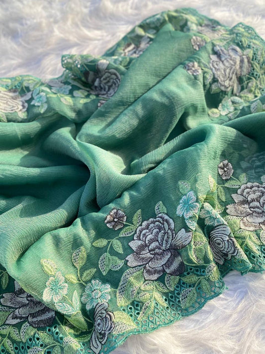 Hand Embroidered Jungle-Green Pure Wrinkle-Chiffon Silk saree with Heavy Border and Blouse