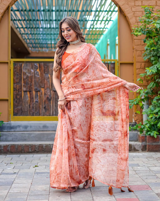 Soft-Orange Pure Organza-Silk saree with all over Zari Sequins and Tassels paired with Blouse