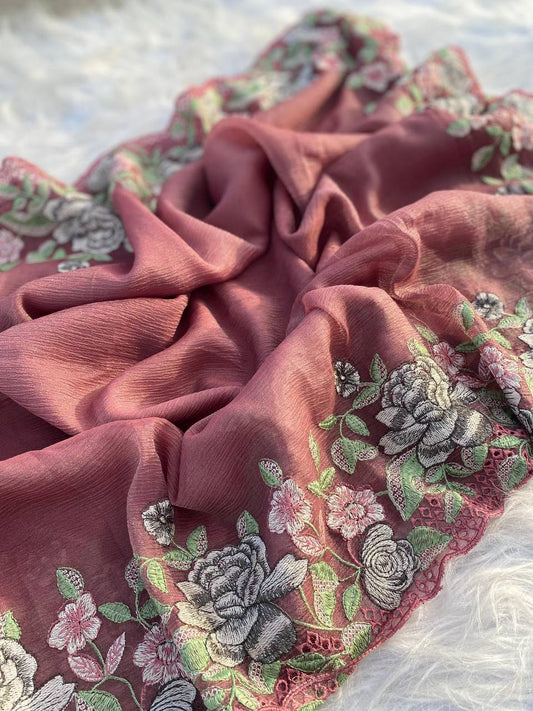 Hand Embroidered Dusty-Pink Pure Crushed-Chiffon Saree in Cut-Work paired with Blouse