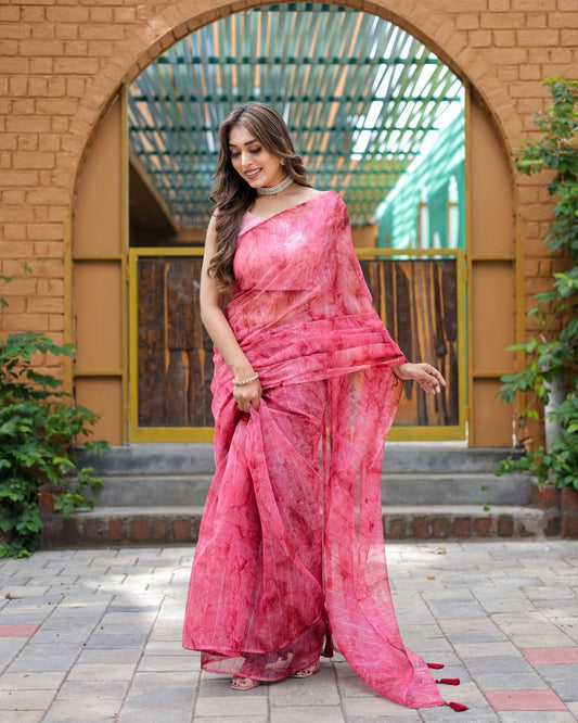 Bright-Pink Pure Organza-Silk saree with all over Zari Sequins and Tassels paired with Blouse