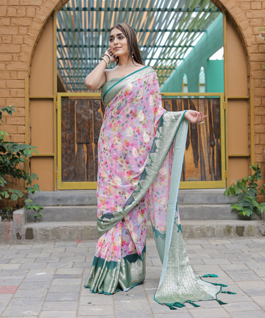 Pure Georgette Light-Pink saree in Digital-Print with Teal Heavy Zari Border and Tassels paired with Blouse