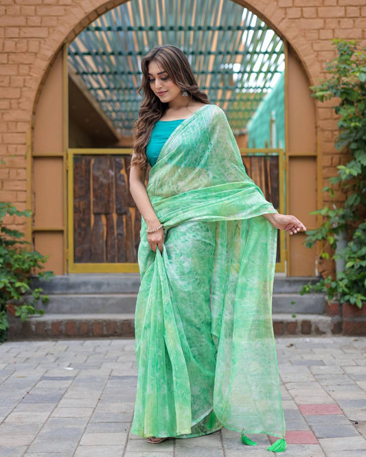 Pista-Green Pure Organza-Silk saree with all over Zari Sequins and Tassels paired with Blouse