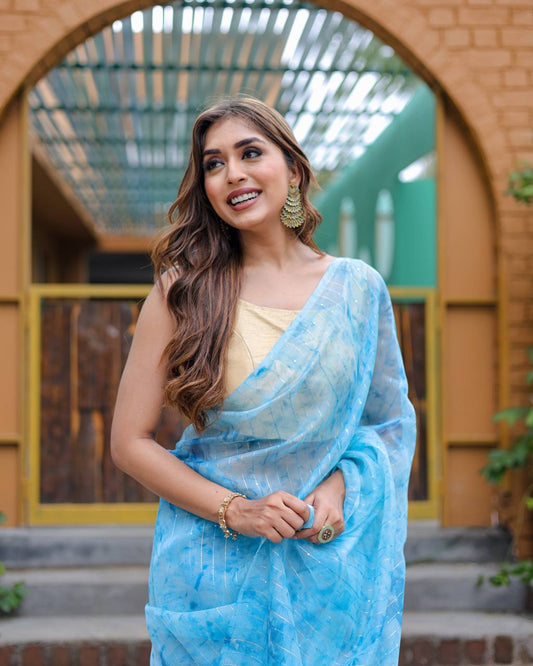 Sky-Blue Pure Organza-Silk saree with all over Zari Sequins and Tassels paired with Blouse