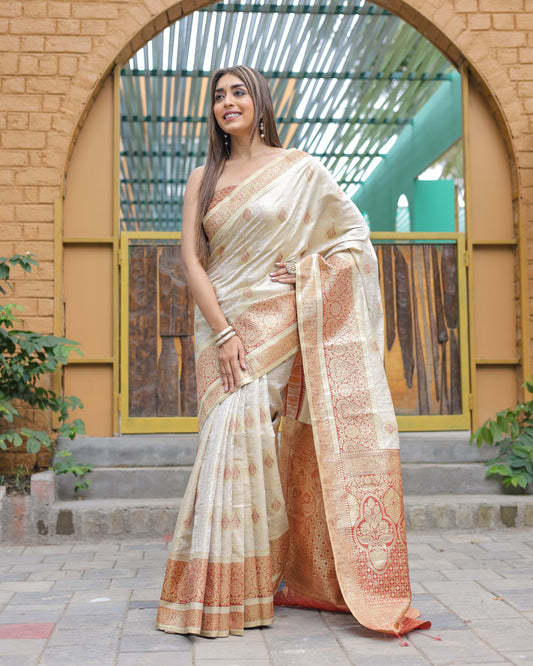 Heavy Embroidered Off-White saree with Red Zari Border paired with Blouse
