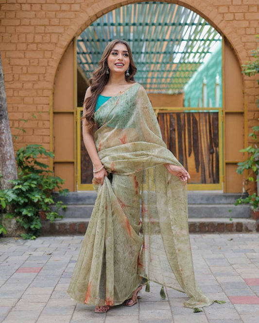 Mehendi-Green Pure Organza-Silk saree with all over Zari Sequins and Tassels paired with Blouse