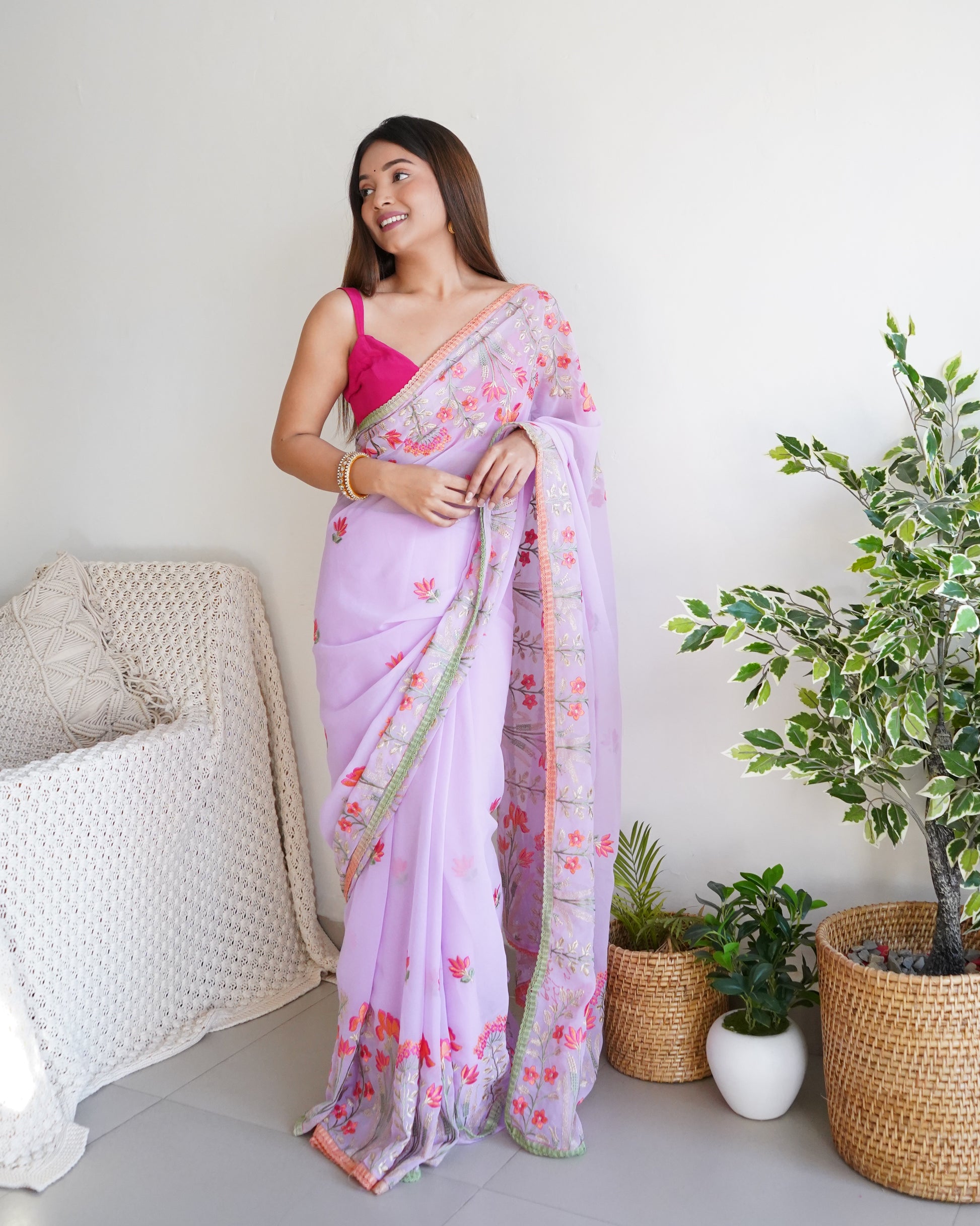 Saree: Hand Embroidered Lilac Pure Goergette saree with Heavy Border paired with Satin Blouse . This stunning piece showcases an elegant blend of pure Georgette, meticulously crafted for a refined drape. Perfect for festive occasions and special events, it exudes sophistication and grace.