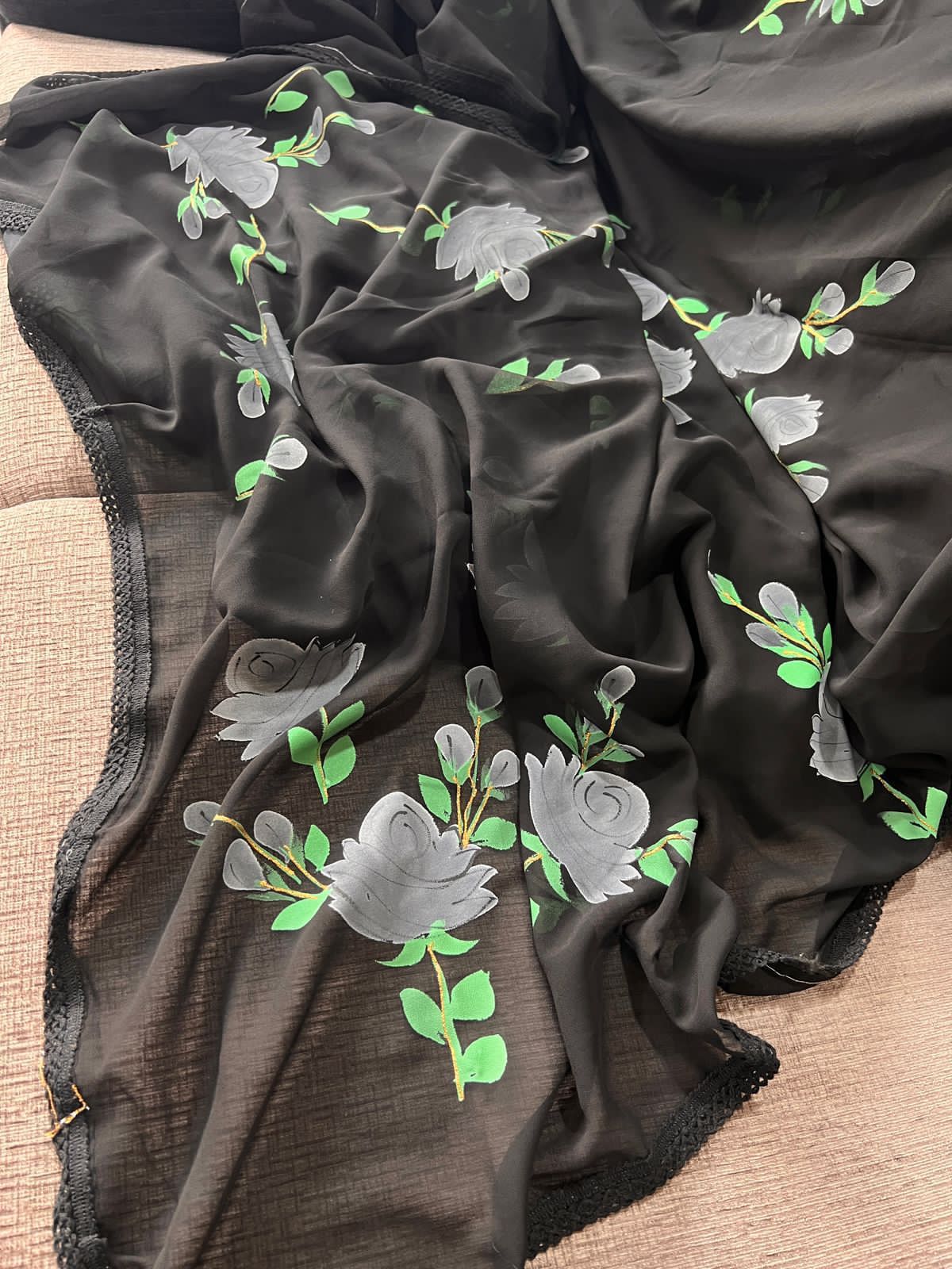 Saree: Elegant Pure Georgette Silk saree in timeless black, ideal for cocktail parties.