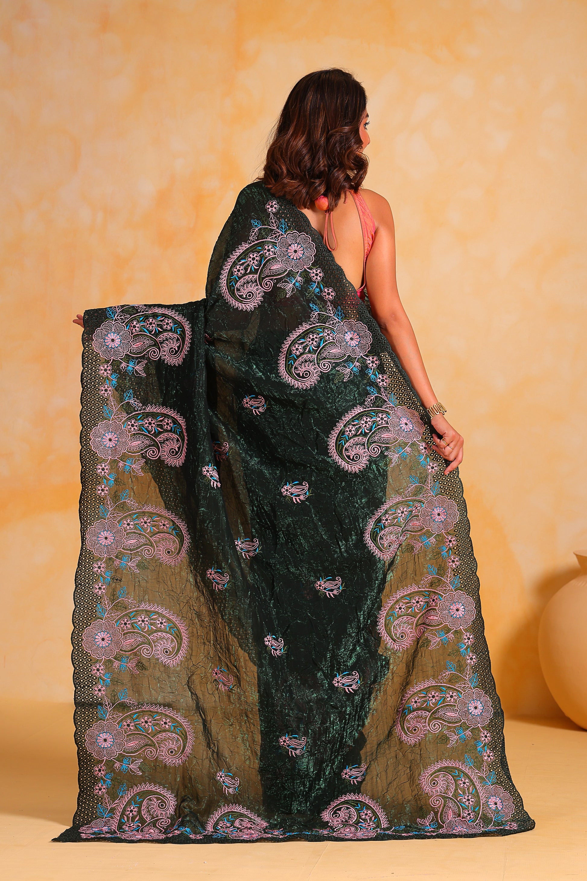 Pure Korean Crushed Shimmer-Silk Beetle-Green saree with Blouse